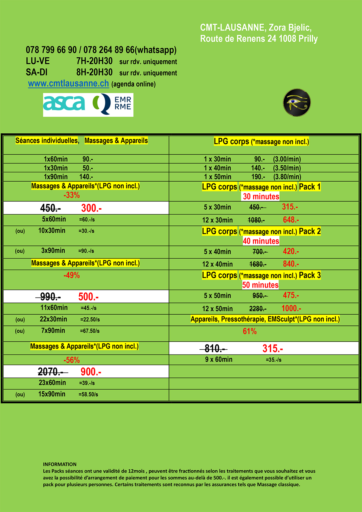 Tous les paiements sont à régler le jour du rendez-vous, en espèces ou par TWINT.