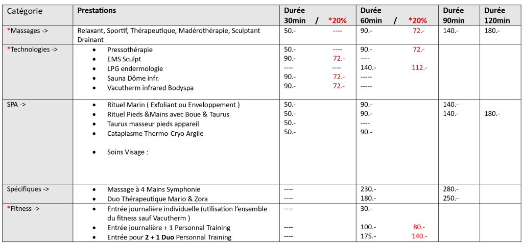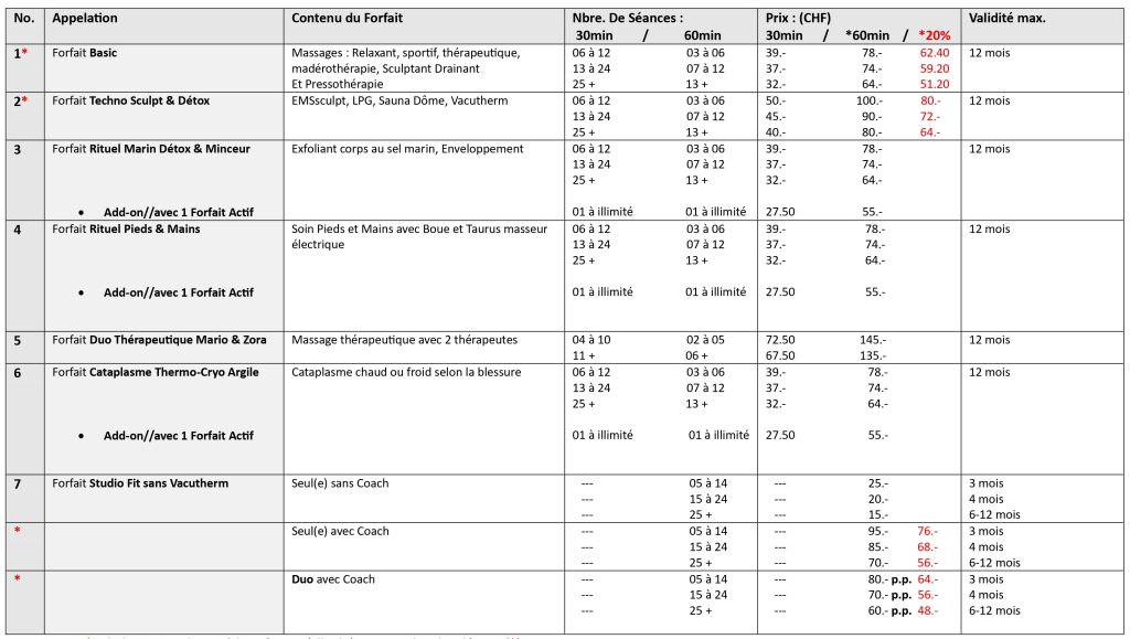 *Rabais 20 % sur les Forfaits, Séances à l’unité ou Formules signalés par (*) : Étudiants, Adolescents, AVS, sans Assur. Complémentaire pour certaines prestations, Entreprise, ou autre.